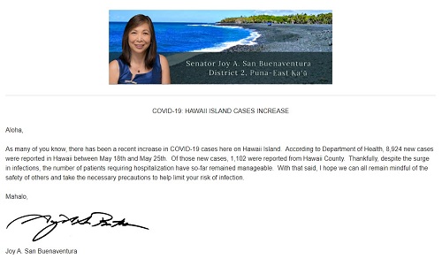 COVID-19 E-Newsletter for June 6, 2020 from the office of Representative Joy San Buenaventura.