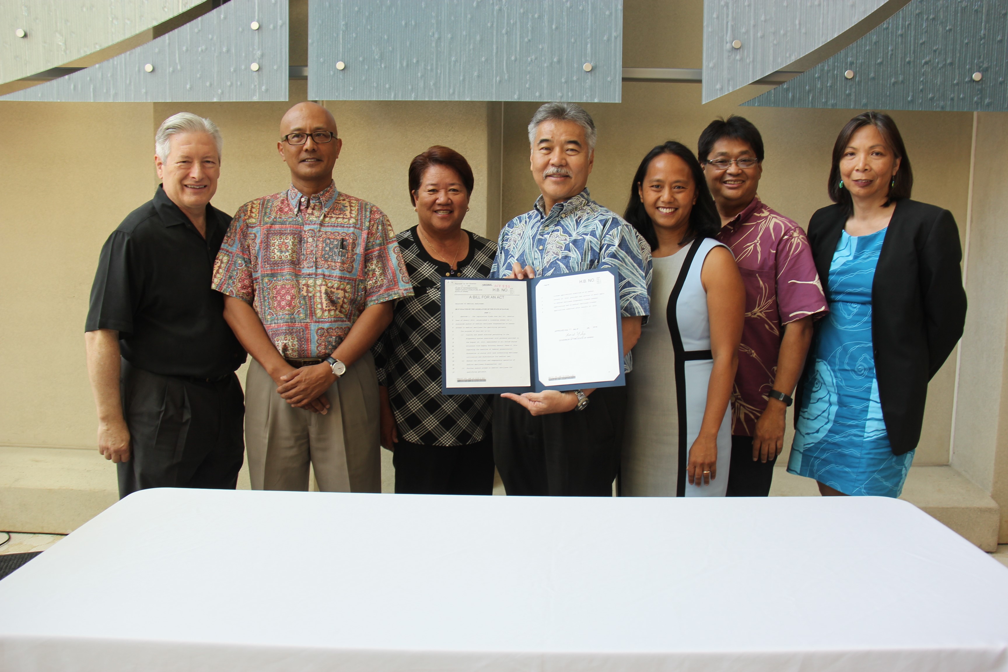 At the John A. Burns School of Medicine (JABSOM) for the signing of the medical marijuana bill HB2707. Pictured: JABSOM Dean, Jerris Hedges; Senator Will Espero; Rep. Dee Morikawa; Governor David Ige; Rep. Della Belatti; Rep. Mark Nakashima and Rep. Joy San Buenaventura.