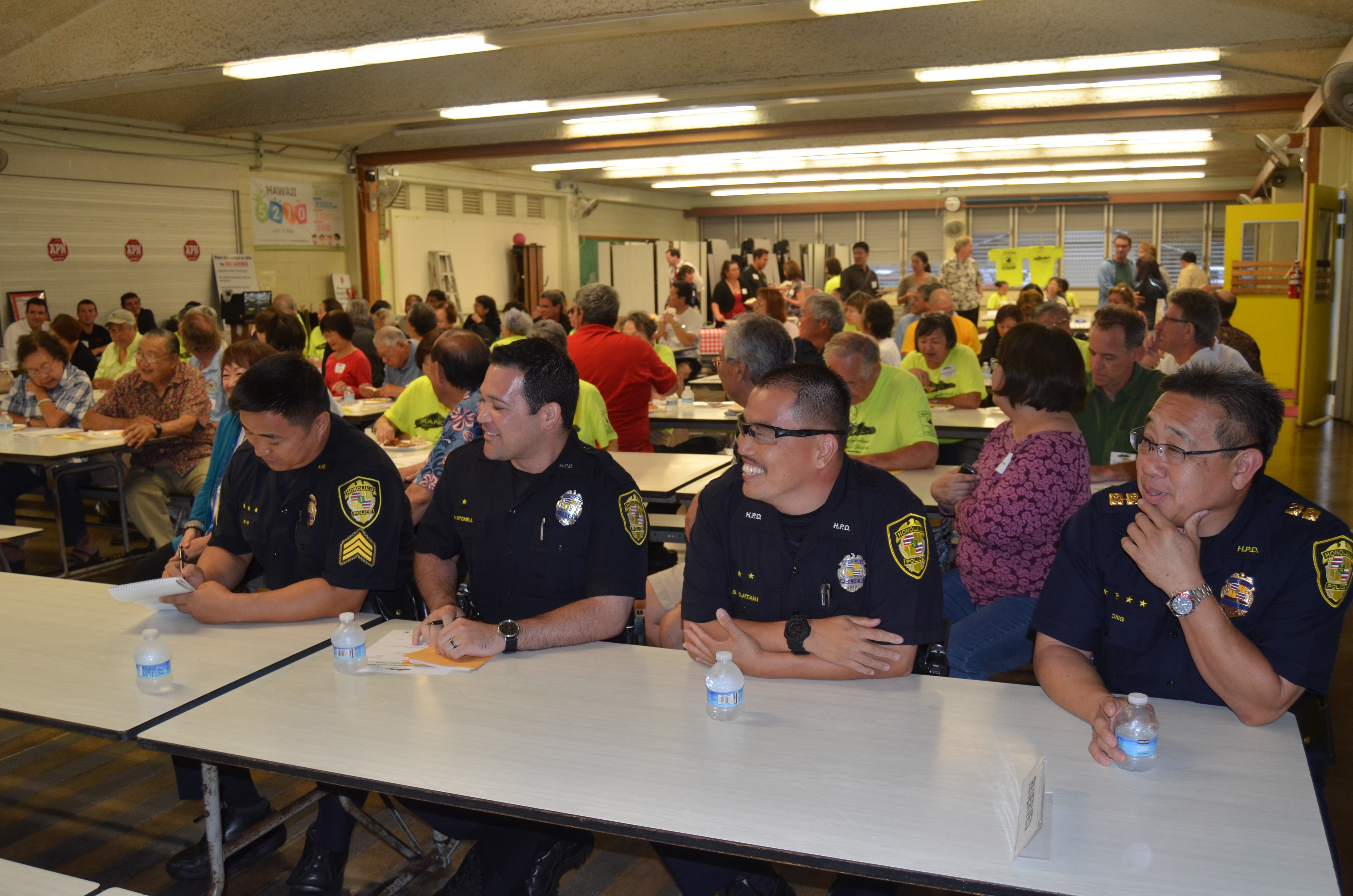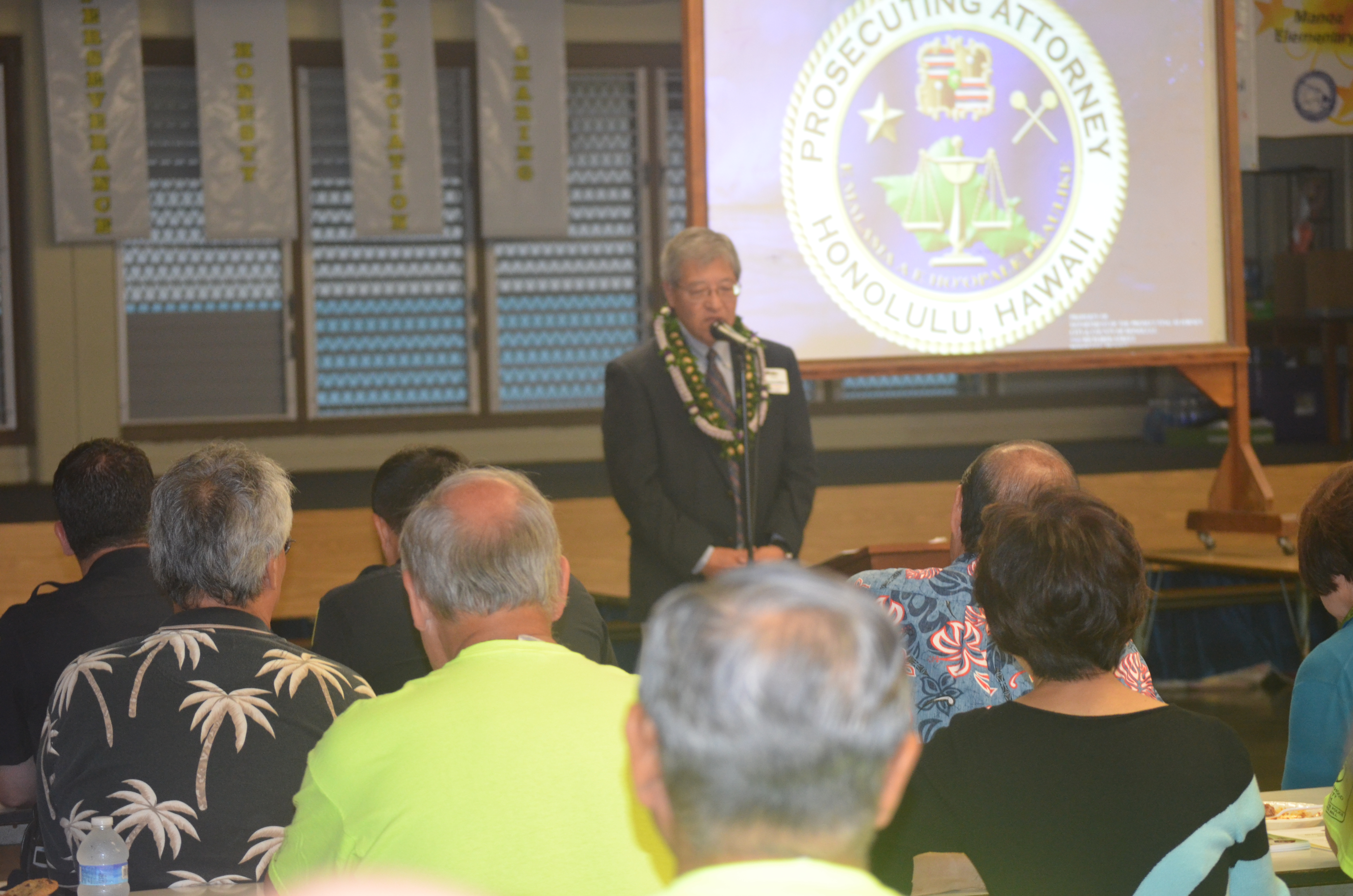 Guest Speaker Prosecuting Attorney Keith Kaneshiro spoke to Manoa NSW Members about protecting their community against crimes, scams and other topics of safety, and HPD District 7 Community Policing Team updated the community on reported crime and answered questions. Great turnout!