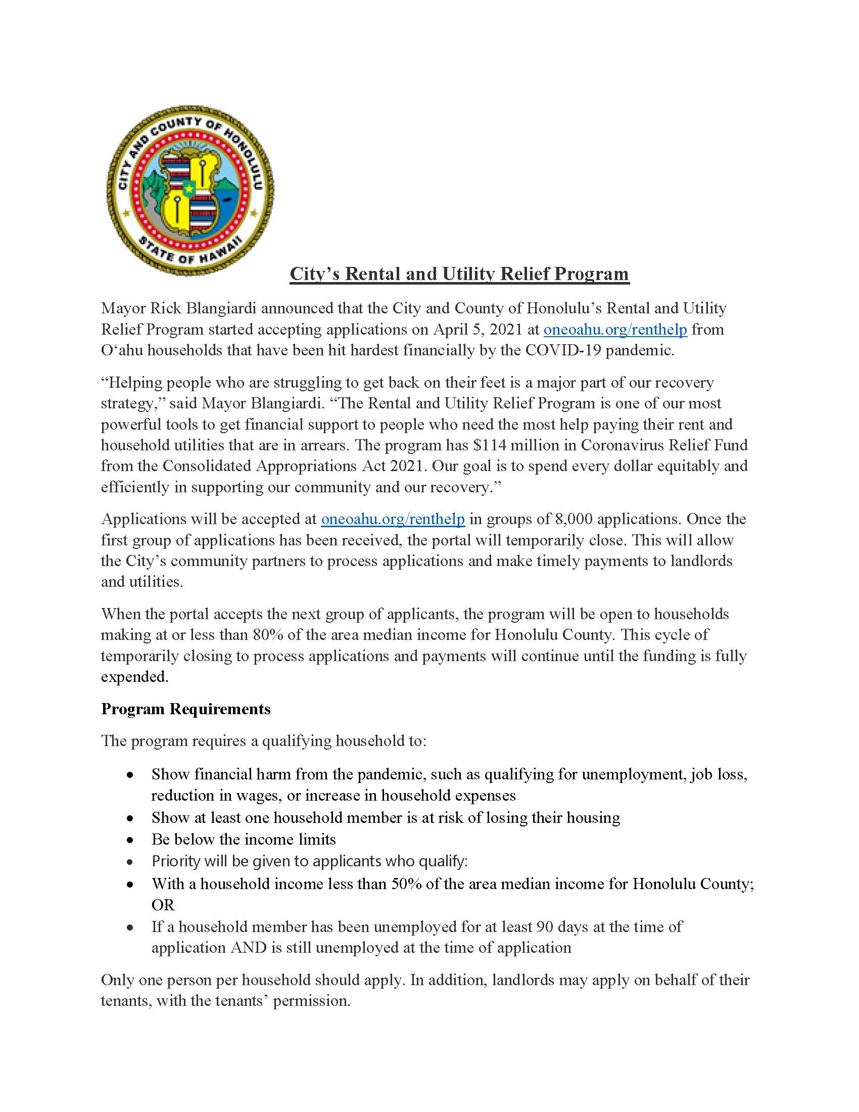 Honolulu Mayor Announces City's Rental & Utility Relief Program